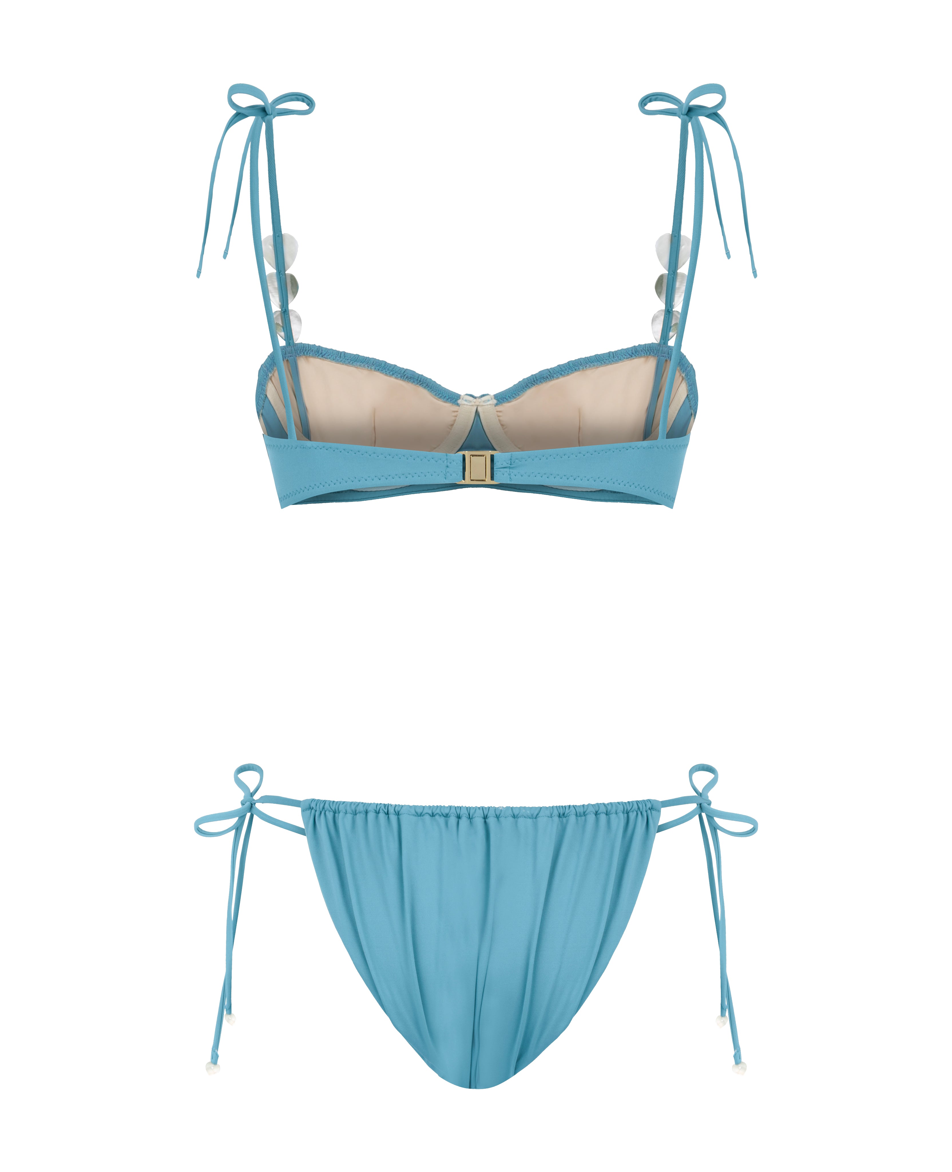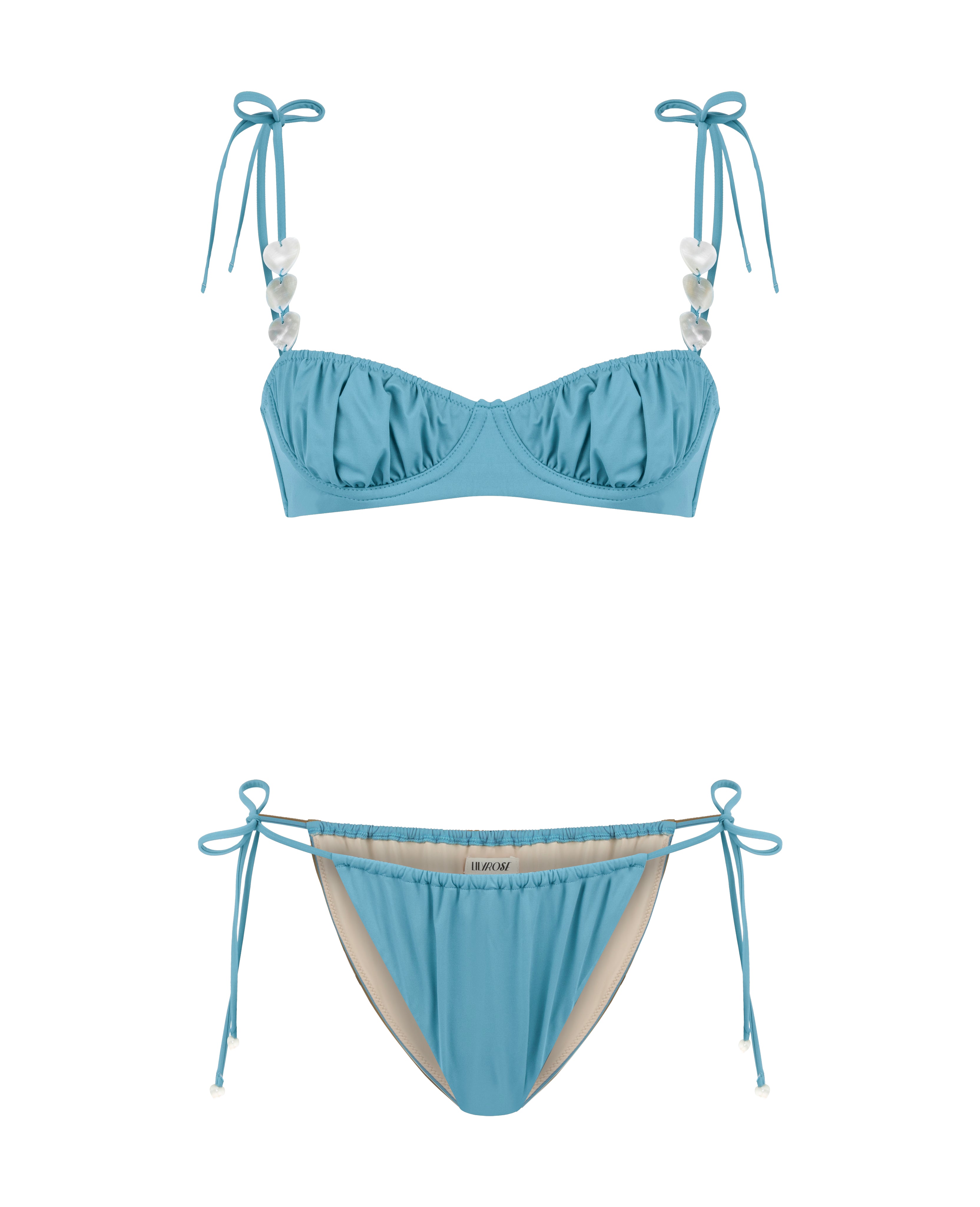 Ruched underwired blue balconette bikini set embellished with heart-shaped mother of pearl details